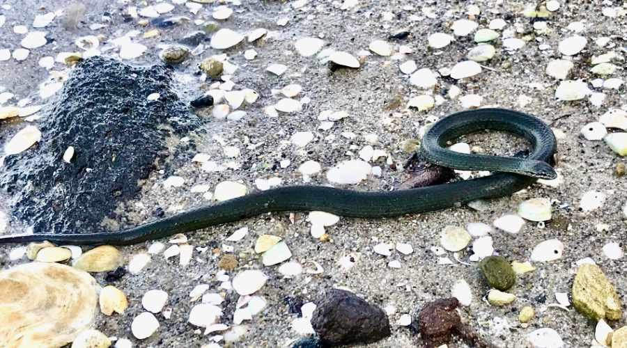 “Ah, yes”, Jo responded as she looked at the creature. “I’ve never seen one in the seawater before.” But, there it was where the water lapped the sandy shore, its head raised and watching us as we watched it.