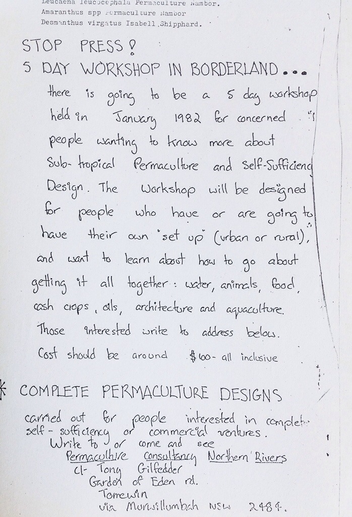 An addendum speaks of the further spread of the design system: “One of the 1980 permaculture design workshops, lectured by Bill Mollison, was held in the Coolangatta region from 27th April to 3rd May, at Tomewin”.