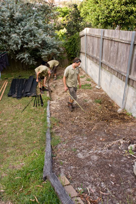 The crew from Sydney Organic Gardens turned up a few minutes ahead of time and soon we were measuring and laying out the position for the beds. In addition to the garden beds, an adjacent slope needed stabilising and work started on this by installing the first retaining wall. Later, we will backfill this and also a second retaining wall, to effectively turn an unstable, unusable bare soil slope into a terraced garden.