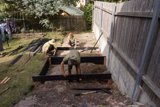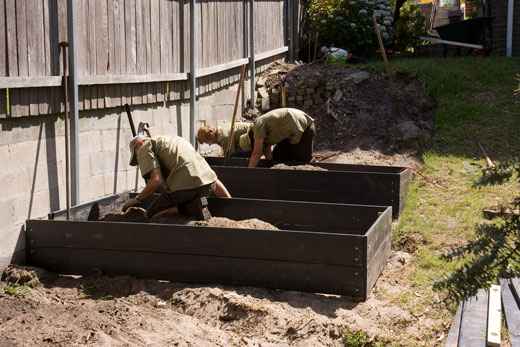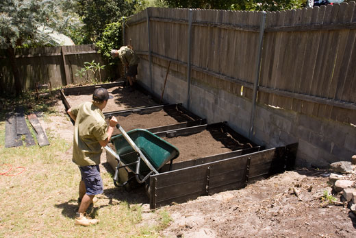 Designwise, we decided on two narrow beds for those veges and herbs plucked frequently – such as leafy greens, tomato, capsicum, eggplant and so on – and a broadbed for those that take a longer time to grow to harvest and for perennial vegetables (those that live and produce over several years). The beds would be raised above the ground and, to produce a good harvest as soon as possible, we decided to bring in an organic-rich growing medium to fill the beds and to supplement the sandy soil.