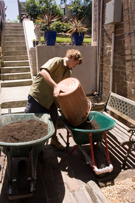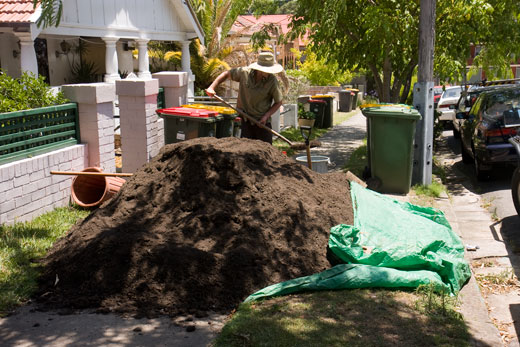 As a 1920s apartment block, there was no driveway to bring materials to us in the backyard, so everything had to be carried manually. The fill was shoveled into buckets and rubbish bins on the footpath, carried down a total of 17 steps, tipped into a wheelbarrow, wheeled carefully down the narrow path and, finally, tipped on to the garden where it was raked into a low mounded shape. It was hot work.