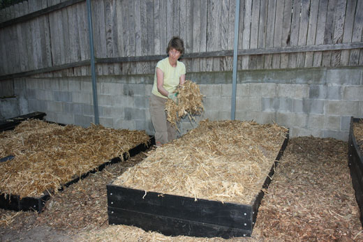 Today, the garden beds having been built and filled by late afternoon the previous day, we were off to the nursery to buy bales of pea straw to mulch the garden. Other than being a good price at the time, pea straw is leguminous, that is, it comes from the pea plant, which is a legume. The advantage of this is that legumes have a biological association with the bacteria that produce nitrogen, one of the main nutrients needed by growing plants. As the mulch breaks down the nitrogen becomes available to the roots of the vegetables, providing them with a source of the plant food.