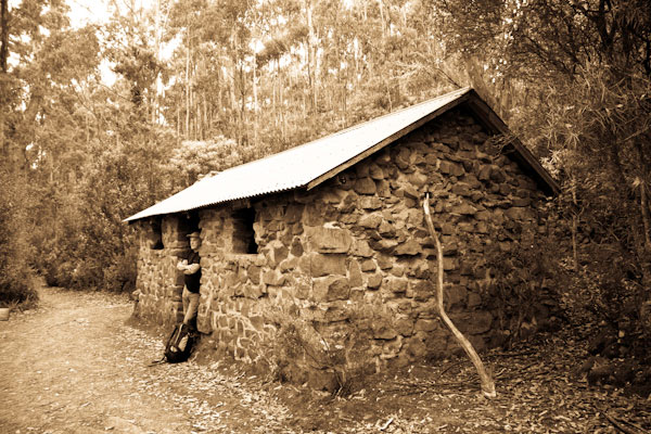 Rock cabin is a simple stone hut. It’s a place to shelter from the inclement weather that can sweep across the mountain but is not an inviting place to overnight—there’s only a steel table, a bench, a fireplace. A limited amount of light flows in through the two small windows and the door is always open because, well… there is none. My recollections of the cabin are of being in a party of walkers stopping off here after a walk up one of the tracks from South Hobart, just one of the many time I stopped by.